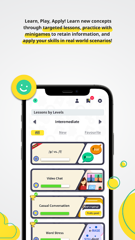 - Lesson: Dedicated, gamified lessons curated by world class English experts and professors.