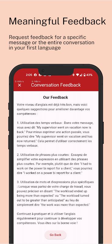 2. 🔄 FEEDBACK IN TEMPO REALE: ricevi un feedback istantaneo sulle tue conversazioni, aiutandoti a identificare le aree di miglioramento e fornendo indicazioni per migliorare il tuo vocabolario e le tue abilità grammaticali.
