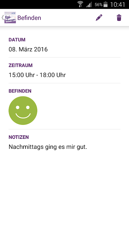 Durch das mobile Tagebuch können Sie, egal wo Sie gerade sind, schnell und problemlos Ihr Befinden sowie Ihre Anfälle, Arzt-Besuche, Krankenhaus-Aufenthalte sowie ggf Ihre Periode festhalten. Mit dem Tagebuch behalten Sie über die Monats-, Wochen- und Tagesansicht oder der alternativen Listenansicht stets den Überblick über Ihre aktuellen Einträge. Auch Fragen an Ihren Arzt sind schnell notiert oder sonstige Bemerkungen können Sie hier dokumentieren. Um Ihren behandelnden Arzt schon vor Ihrem Termin über den Verlauf und Ihre dokumentierten Einträge zu informieren, können Sie ihm diese Tagebucheinträge ganz einfach vorab per E-Mail als PDF senden. Alternativ können Sie diese Tagebucheinträge auch ausdrucken, um sie Ihrem behandelnden Arzt persönlich zu überreichen.