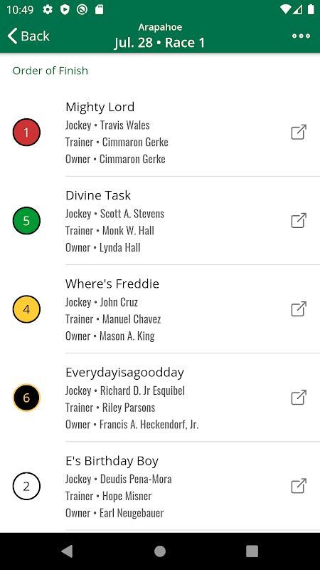 Ogni gara include la tabella dei risultati ufficiale di Equibase e un video replay (è richiesto l'abbonamento). I grafici dei risultati offrono un riepilogo dell'intera razza, tra cui l'ordine completo di arrivo, la descrizione descrittiva per ciascun cavallo, le informazioni sulle probabilità e sui guadagni, oltre a numerosi altri dati sui risultati per uno sguardo completo alla gara.