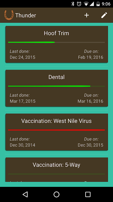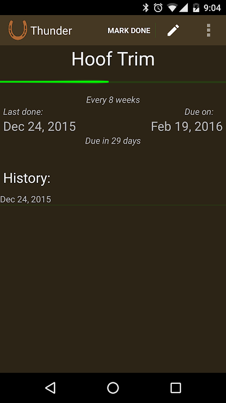Ti aiuta a registrare quando i compiti di cura cavallo sono stati lo scorso completati e sono dovuti successivo in base a una pianificazione definita, rendendo più facile per pianificare in anticipo, risparmiare denaro e mantenere il vostro gregge sano e felice.