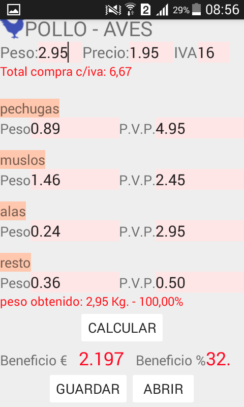 Simple aplicación que calcula el Beneficio comercial de canales o productos elaborados para carnicerías. Pruebe a modificar los precios de venta al público y después pulse el botón calcular hasta que obtenga el margen apropiado.