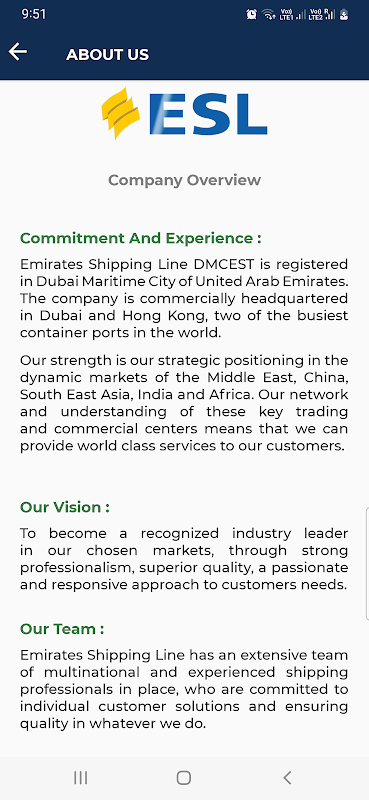 ESL (Emirates Shipping Line DMCEST) è una compagnia di spedizioni di container in tutto il mondo che serve con reti di trasporto dinamiche ed estese nelle regioni in rapida crescita del Medio Oriente, Estremo Oriente asiatico, Sud-est asiatico, Sub-continente indiano e Africa.