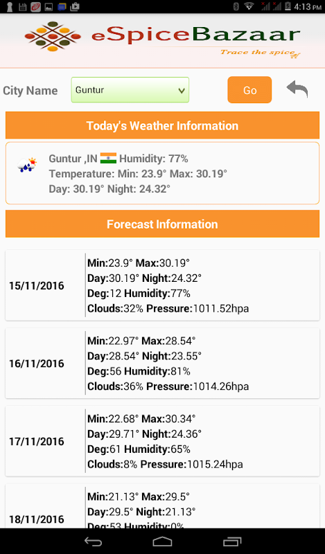 As part of eSpice Bazaar initiative by Spices Board of India, Field Coordinator mobile app shall assist the Field Coordinators to capture details of Farmers, their Farms, Crops & Farming practices, Yield etc. in real time straight from the field. The app has in-built GPS capabilities to identify the farm location. App shall also provide real time weather information, market price data and directory of service providers.