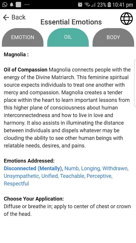 L'app Essential Emotions ti consente di cercare oli, emozioni o preoccupazioni specifiche del corpo, quindi ti guida attraverso l'elaborazione del supporto per arrivare alla radice della tua preoccupazione. Identifica l'emozione negativa che stai provando al momento o scegli quella positiva che vuoi provare tra 500+ emozioni, 100+ oli essenziali o 250+ parti e sistemi del corpo. Applicare l'olio essenziale raccomandato, quindi riprogrammare i modelli di pensiero e di comportamento usando le domande per approfondire, le dichiarazioni e i suggerimenti di visualizzazione.
