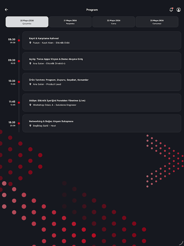 Con l'applicazione, gli utenti possono partecipare facilmente agli eventi tramite QR/codice/link, accedere a programmi, annunci, informazioni su hotel/trasporti, supporto e contenuti sulla destinazione. Possono visualizzare tutti gli eventi a cui partecipano in un unico posto.