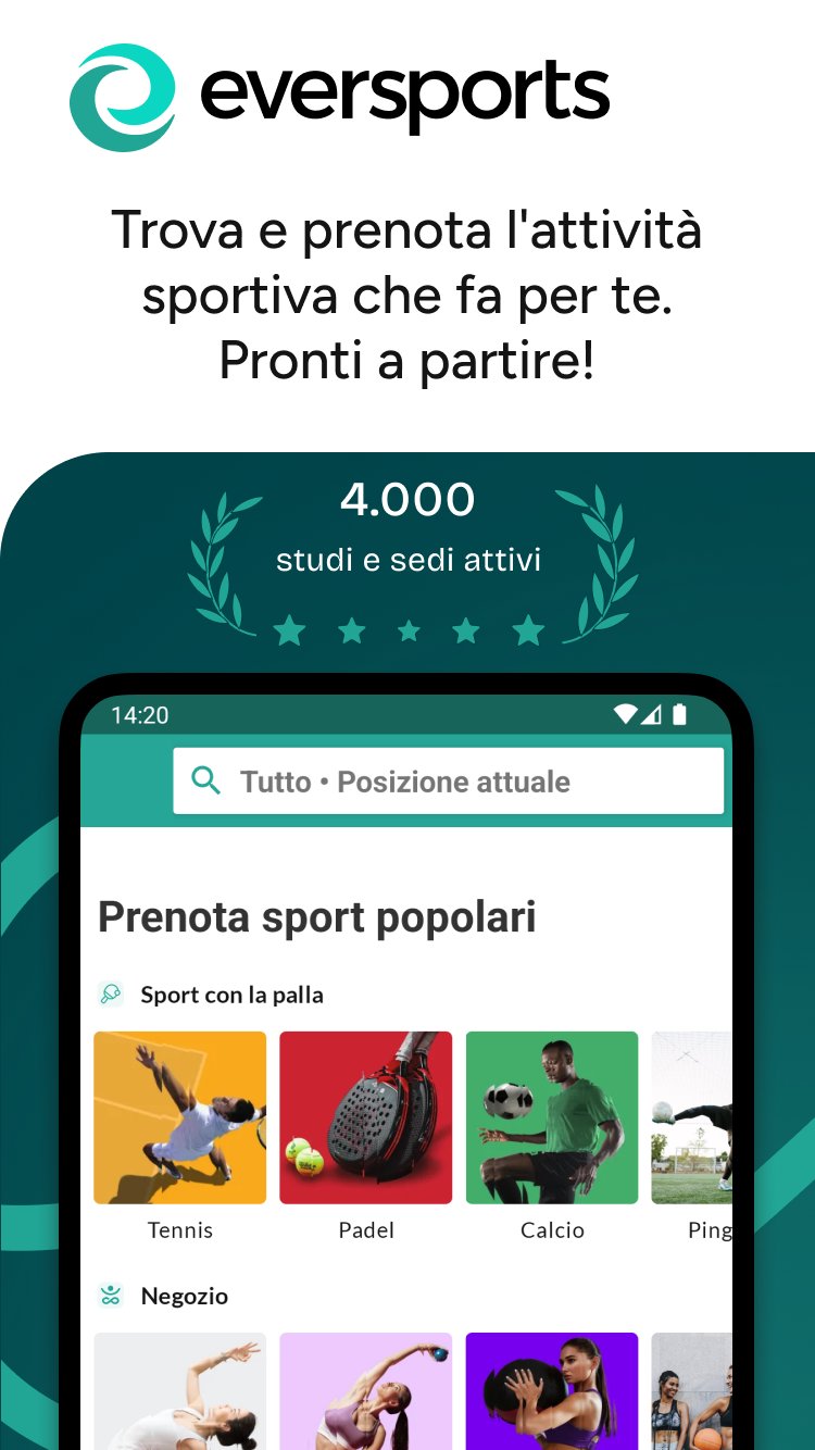 Trova, prenota e paga i tuoi sport preferiti ovunque sei e in qualsiasi momento con l'app Eversports. Eversports è il modo più facile di prenotare workshop, lezioni, campi, allenamenti, camp, retreat e corsi di formazione. Con Eversports puoi accedere a più di 1500 strutture sportive e studio in Austria, Germania, Svizzera e Olanda. Puoi trovare svariati tipi di sport come tennis, yoga, pilates, CrossFit, calcio, badminton, squash, fitness e molto molto altro. Con l’app Eversports accedere ai tuoi sport preferiti sarà più semplice che mai: * Everytime: Eversports è sempre disponibile. Prenota 24 ore su 24, 7 giorni a settimana. * Everywhere: con Eversports puoi prenotare ovunque sei. Dal tuo smartphone mentre sei per strada o dal tuo computer in ufficio o a casa. * Everything: con Eversports puoi tenere sempre tutto sotto controllo. Puoi scegliere i tuoi sport preferiti, prenotarli in pochi clic e sapere tutto sui tuoi prodotti e sulle tue visite. Scegli l’accesso più semplice ai tuoi sport e alle tue strutture preferite. Everytime. Everywhere. Eversports. Saremo felici di leggere il tuo feedback su Eversports. Mandaci le tue idee su come possiamo migliorare l’app all’indirizzo