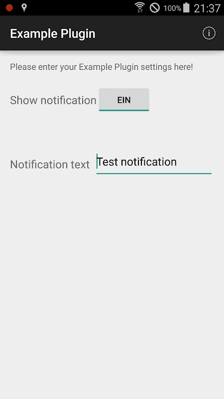 The app only displays a notification on the device, when an event occurs in EgiGeoZone and is intended as example for developers, who wants to write a plugin for EgiGeoZone.