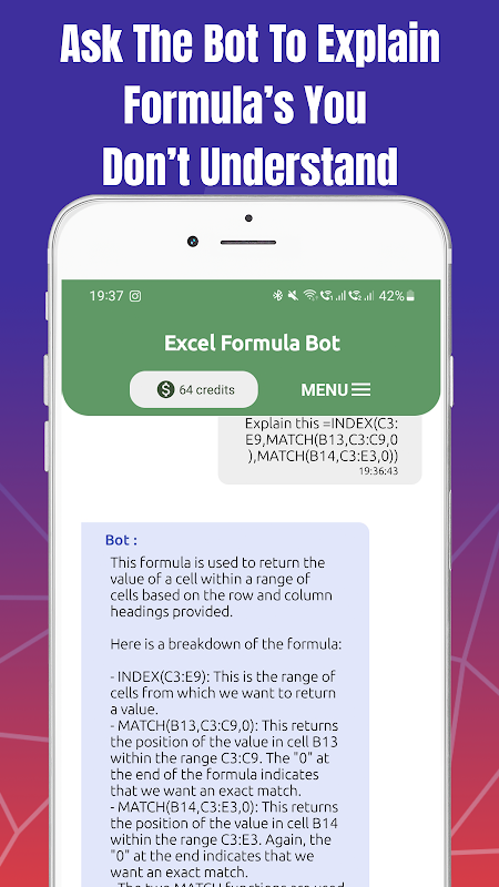La nostra app è alimentata da ChatGPT, un motore di elaborazione del linguaggio naturale all'avanguardia che comprende le tue richieste e genera la formula perfetta per le tue esigenze. Che tu abbia bisogno di calcolare una somma, trovare una media o eseguire complesse analisi dei dati, Excel Formula Bot ti ha coperto.