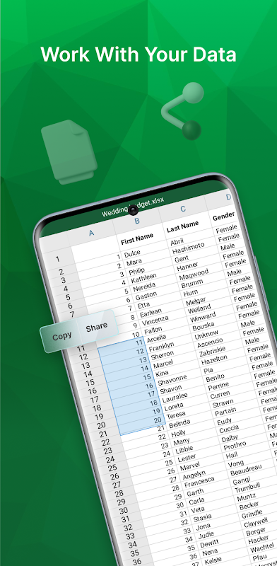 Scarica il nostro visualizzatore Excel: visualizza l'app xlsx e xls oggi stesso e assumi il controllo dei tuoi fogli di calcolo con facilità. Perfetto per professionisti, studenti e chiunque abbia bisogno di accedere ai file Excel sul proprio dispositivo mobile.