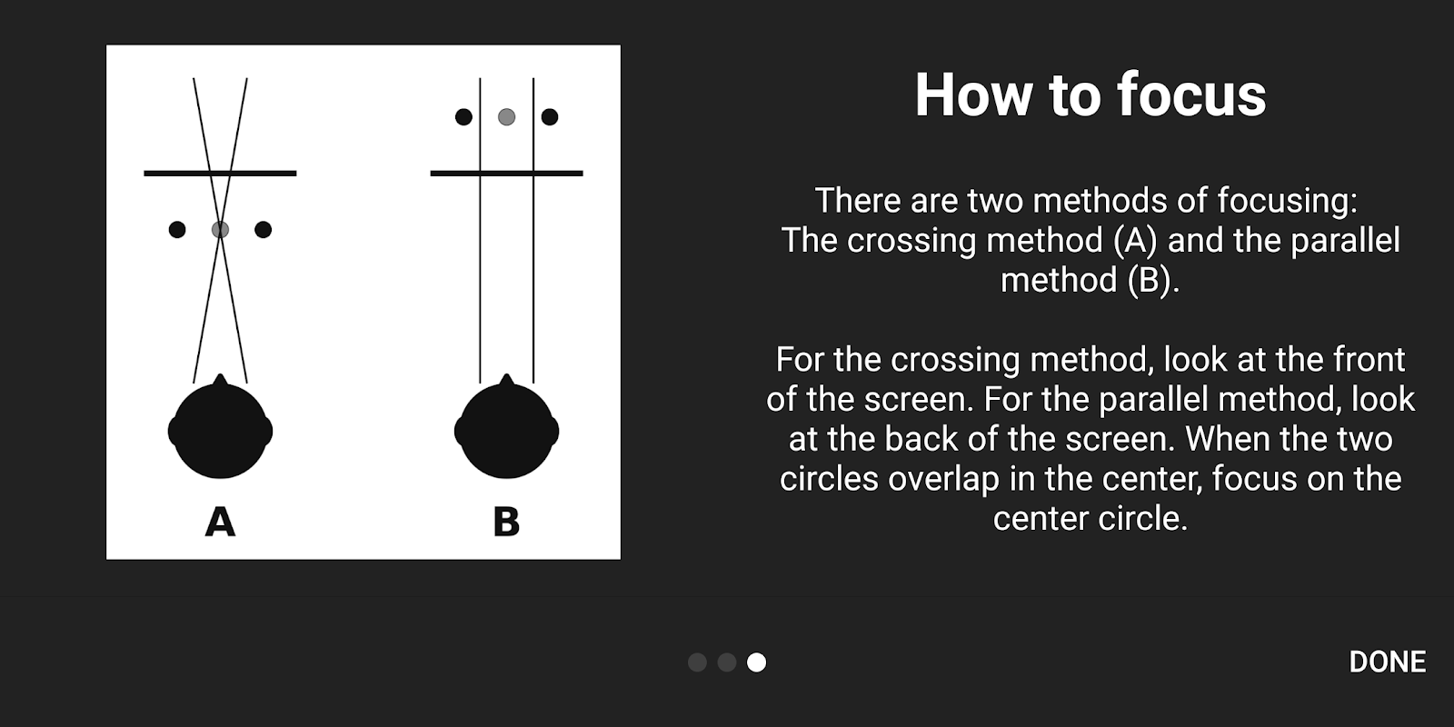 A. **Metodo strabico**: mettere a fuoco davanti allo schermo (incrociando gli occhi).