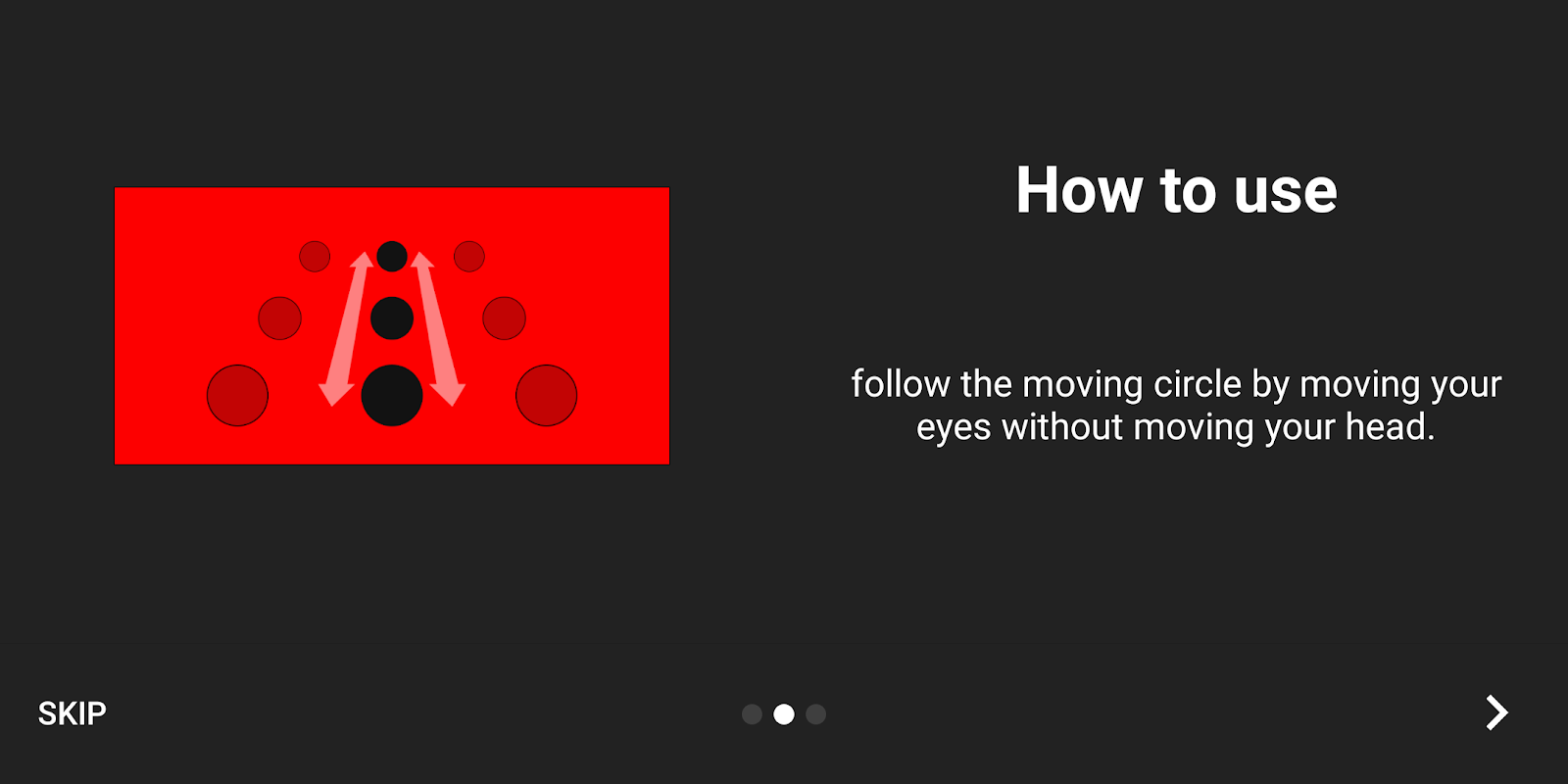 È un semplice esercizio che rafforza i muscoli intorno agli occhi. Basta fissare i due cerchi sullo schermo finché non si sovrappongono, quindi seguire il loro movimento solo con gli occhi, senza muovere la testa.