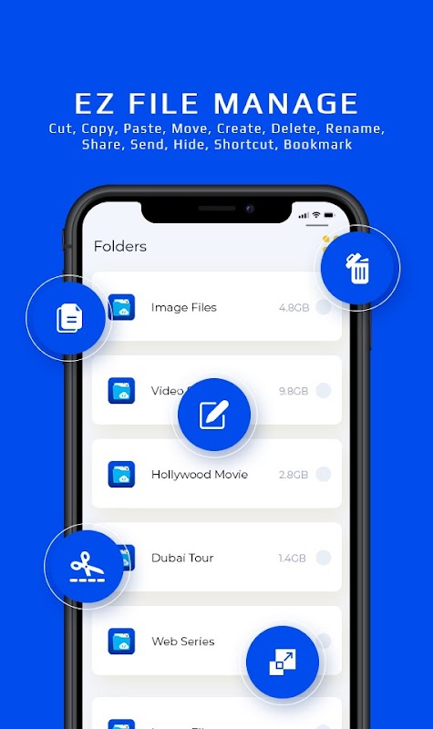 Manage your files like you do on your desktop or laptop using Multiple Select, Cut/Copy/Paste, Move, Create, Delete, Rename, Search, Share, Send, Hide, Create Shortcut, and Bookmark.