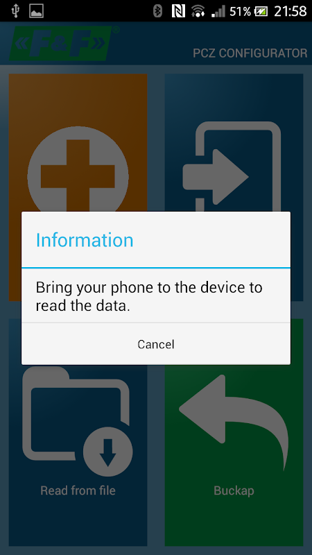 F & F PCZ Configurator è un'applicazione che permette la configurazione remota (NFC) di timer di controllo programmabili PCZ-521,3, PCZ-522,3, PCZ-529.3 e orologi astronomici PCZ-524,3, PCZ-525,3, PCZ-526.3.