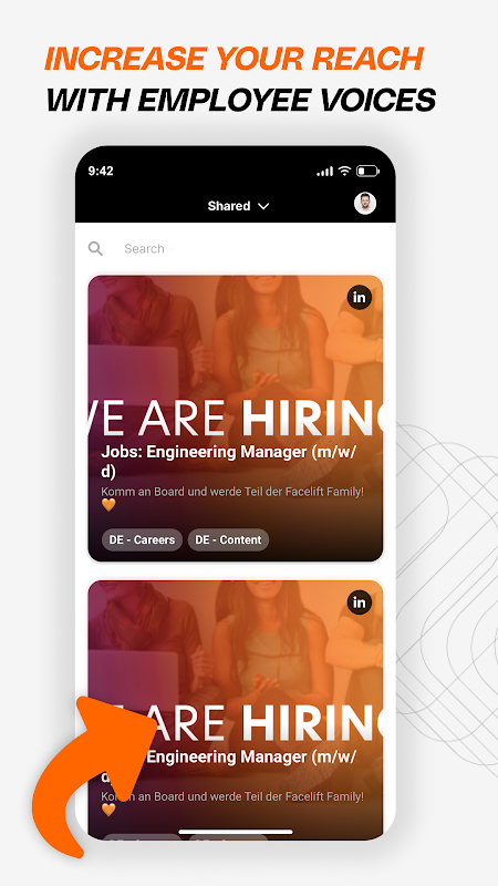 Consenti ai tuoi dipendenti di diventare influencer aziendali con l'app Facelift Amplify. Gestisci facilmente la tua rete di influencer, fornisci contenuti centralizzati e consenti ai dipendenti di condividere il loro entusiasmo per il tuo marchio.