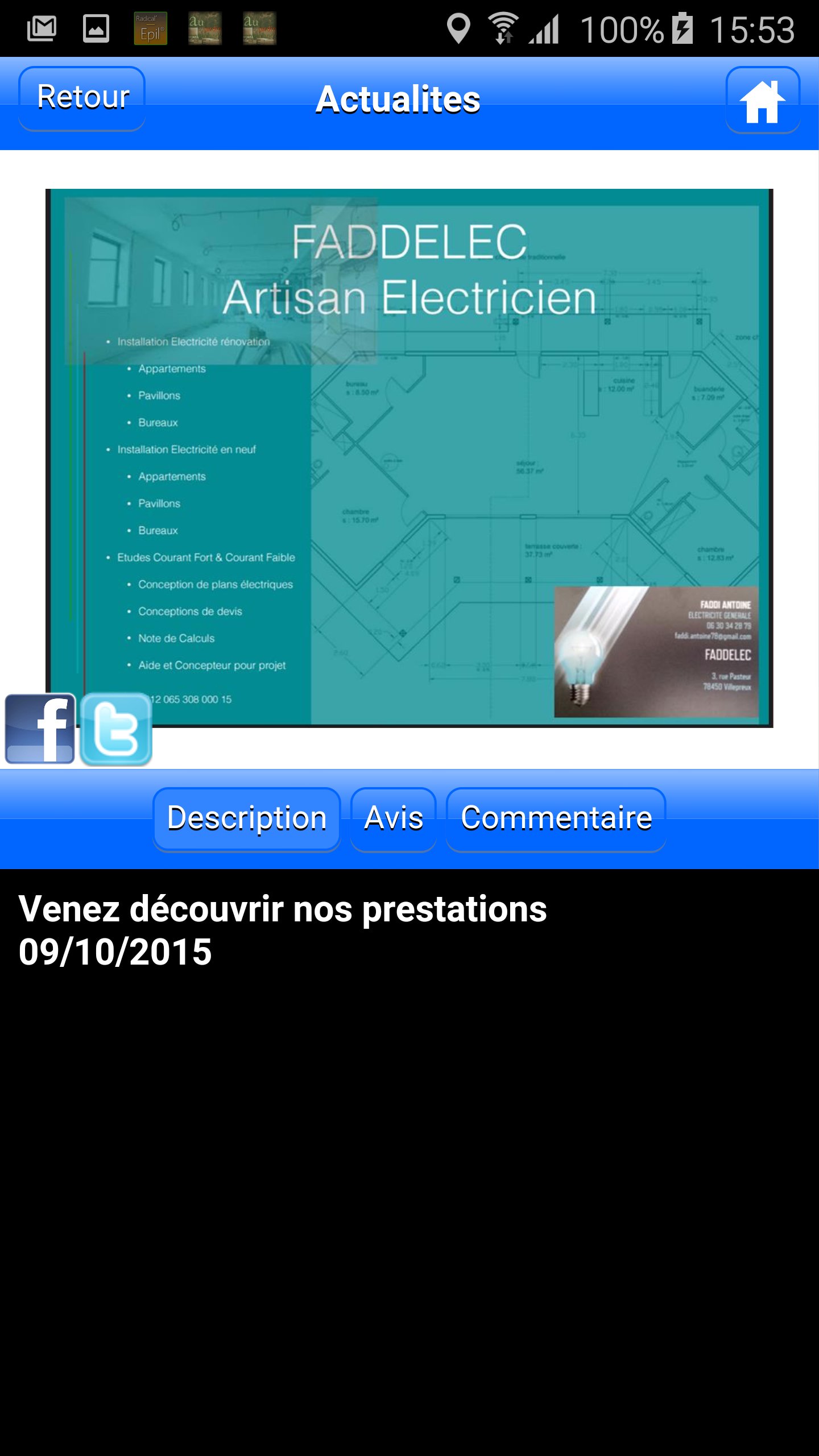 L'application Faddelec vous offre la possibilité de consulter toutes les infos utiles de l'électricien (Tarifs, prestations, avis…) mais aussi de recevoir leurs dernières News ou Flyers sous forme de notifications Push.