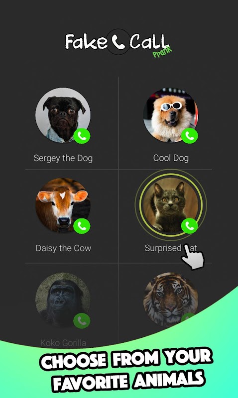 Fake Call Prank viene fornito con diversi suoni di animali che vanno da cani e gatti a gorilla e leoni. Scegli il tuo animale preferito per fare uno scherzo ai tuoi amici.