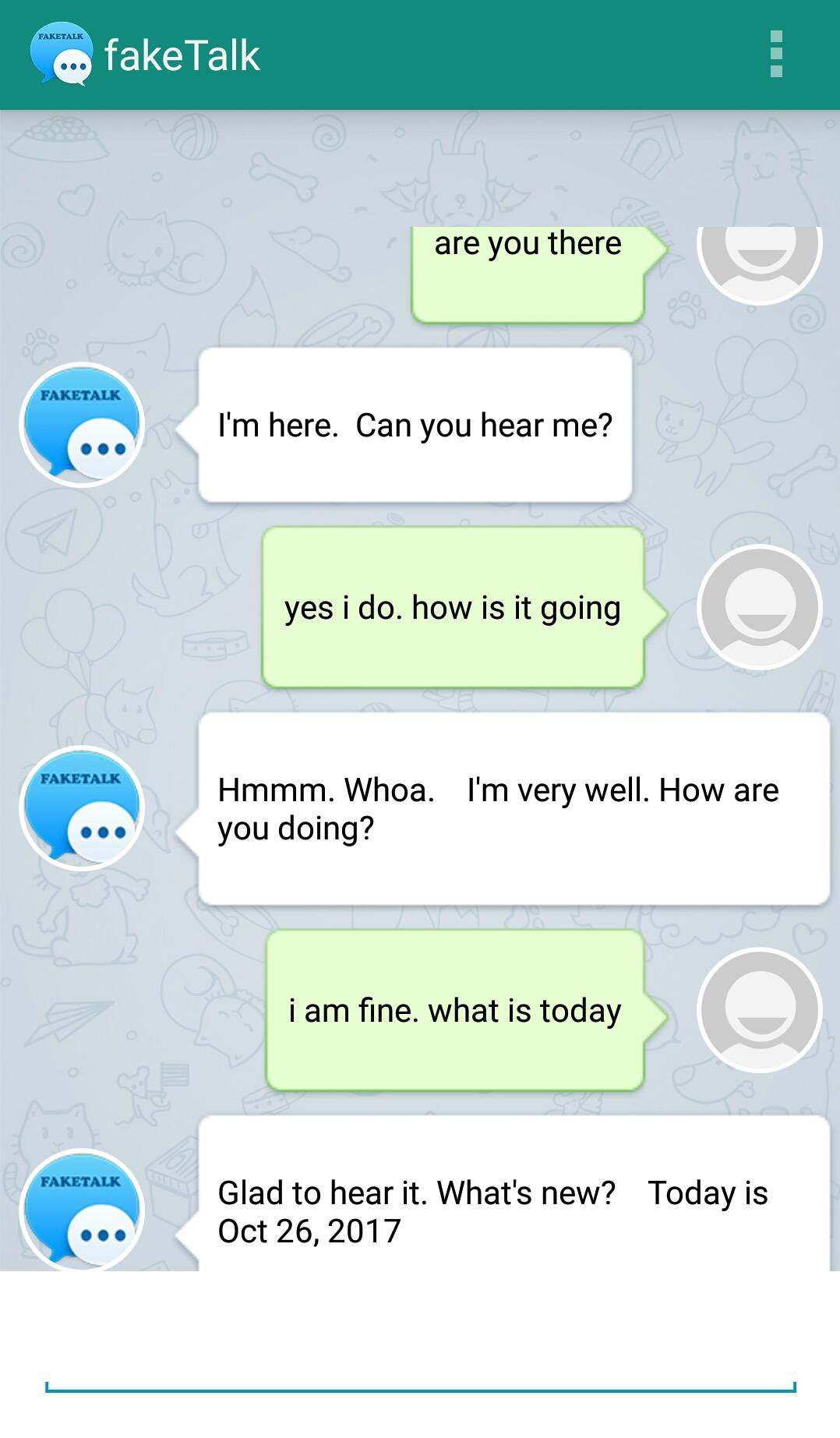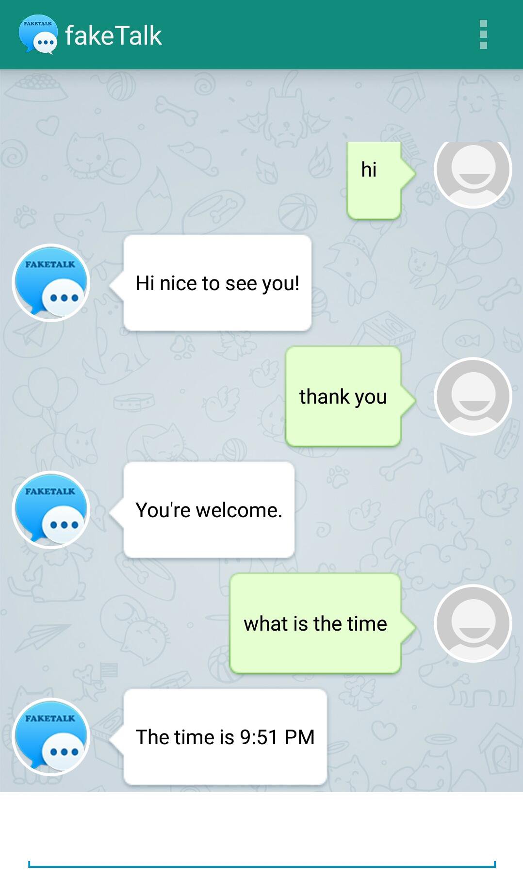 FakeTalk was designed from the ground up to be your companion and friend. If you are looking for a romance, a love chat on a lonely night, a friend to sit by, or simply someone you can tell all your troubles to, then FakeTalk is for you. FakeTalk understands everything you tell him and is always eager to talk and learn new things.
