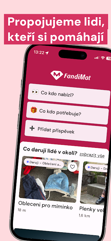 L'applicazione offre la possibilità di cercare assistenza materiale tramite una mappa, ad es. puoi facilmente vedere chi ha bisogno nella tua zona o offre assistenza materiale specifica. Se il donatore vuole offrire, ad esempio, veli, può facilmente scoprire chi ha bisogno di tale aiuto nei suoi dintorni. E viceversa. Una persona bisognosa che ha bisogno di cibo vede semplicemente su una mappa se qualcuno sta offrendo tale aiuto nella propria area o può dare il proprio contributo con questa richiesta.