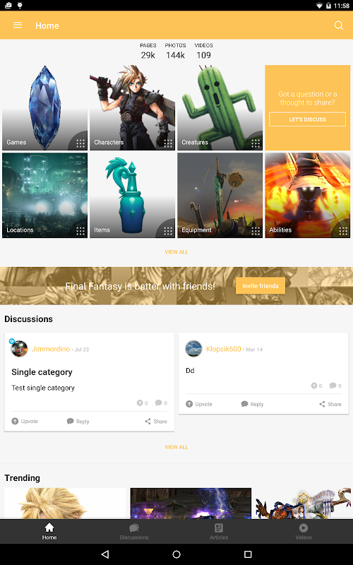 - Navigazione: categorie e articoli creati dalla community di Final Fantasy e ordinati per popolarità