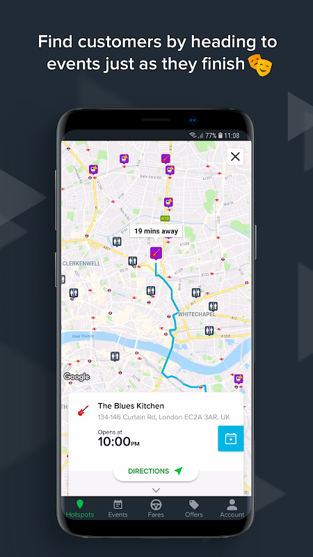 Hotspots are data driven areas of high customer demand so you can find your next ride faster and make more money! You’ll also see driver friendly restrooms, petrol stations and electric charging points on the map. If you’re a driver in London, you’ll see live transport disruptions on the map too (coming to more cities soon).