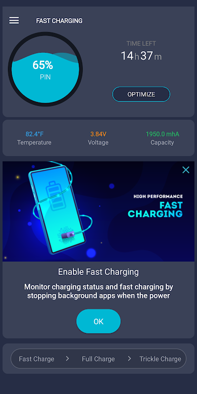 Risolvi tutti i problemi della batteria con un'unica app. Questa app contiene protezione della batteria, ottimizzazione della batteria e ricarica rapida della batteria. Si attiverà automaticamente quando colleghi il caricabatterie al telefono per aumentare la velocità di ricarica fino al 40%. Nel corso del tempo i telefoni potrebbero diventare più lenti e esaurire la batteria più rapidamente a causa delle app in esecuzione in background che fanno funzionare la batteria continuamente. Ciò potrebbe causare il consumo della batteria e una ridotta durata della batteria. Questa app ti aiuta a ottimizzare le impostazioni della batteria in modo da risparmiare energia e caricare il telefono più velocemente.