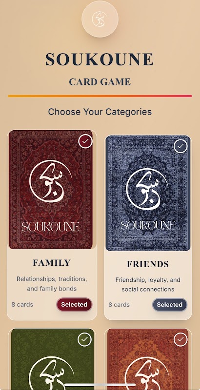 Fatha di Soukoune trasforma la riflessione in un gioco. Scegli uno o tutti e quattro i mazzi tematici: Famiglia, Amici, Islamico e Personale, ognuno contenente otto carte con domande accuratamente realizzate che incoraggiano una discussione profonda e senza giudizi e l'autoesplorazione.