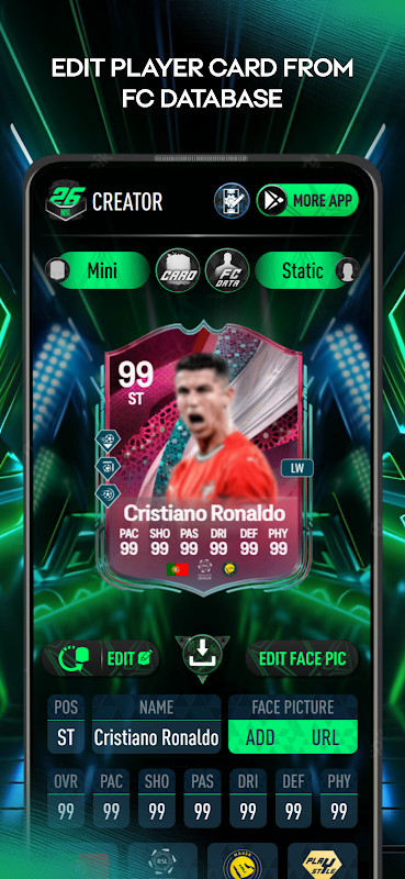Crea e personalizza le tue carte giocatore FC 26 con statistiche reali, foto e design unici. Esplora il database FUT e crea la squadra dei tuoi sogni. Ecco le caratteristiche principali che rendono questa app perfetta per ogni appassionato di calcio: