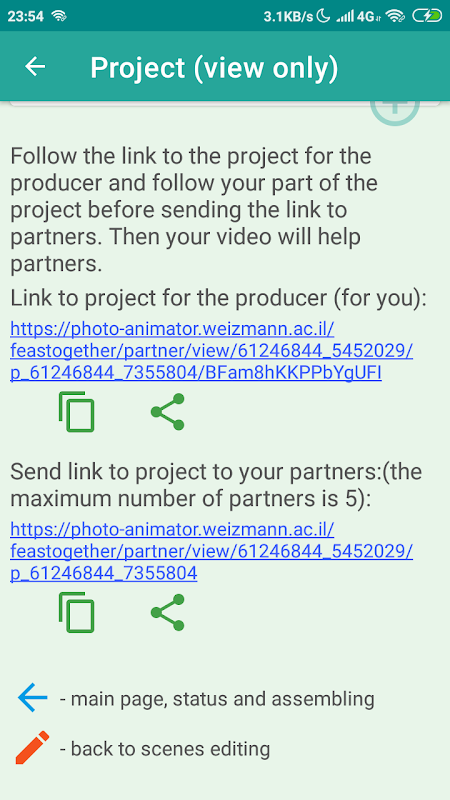 2. Facendo clic sul pulsante "Crea collegamenti", riceverai due collegamenti: uno per il produttore, l'altro per i tuoi partner. Segui il link al progetto per il produttore e segui la tua parte del progetto prima di inviare il link ai partner.
