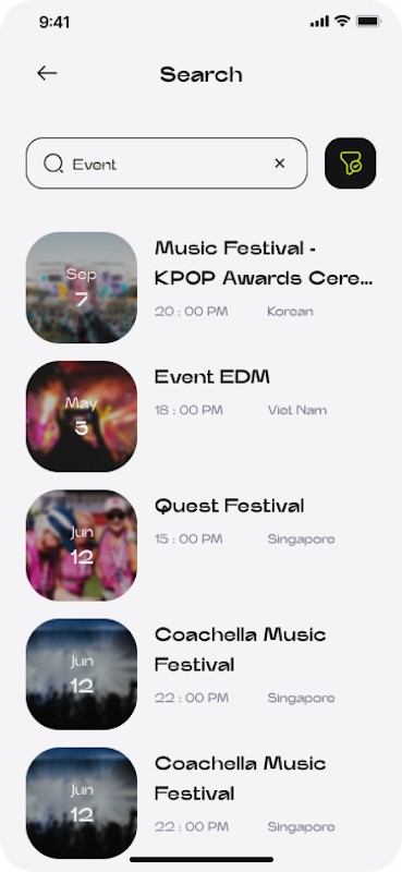 Con Festify, trovare il tuo prossimo evento è un gioco da ragazzi. Esplora una vasta gamma di concerti, festival, workshop e altro ancora, il tutto in un'unica comoda posizione. Che tu sia interessato alla musica, all'arte, al cibo o al fitness, Festify ha qualcosa per tutti.