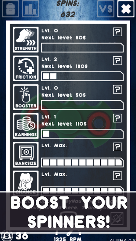 - Acumulate and expend your spins to unlock new spinner models and backgrounds.
