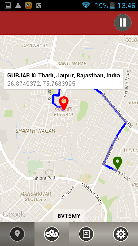 Utente sarà in grado di impostare la posizione e possono condividere il codice di accesso con un singolo utente o un utente multiplo. Dopo aver utilizzato il codice di accesso condiviso nel manuale d'applicazione possono condividere e tenere traccia della posizione, al fine di capire l'esatta posizione di un altro utente. Percorso salverà nella storia cui l'utente può verificare dopo un po 'e traccia sulla mappa offline.
