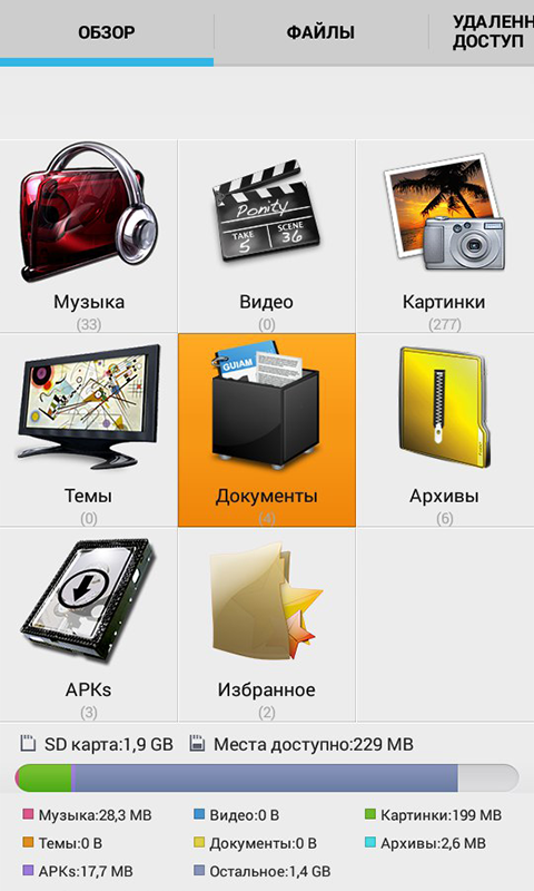 È anche possibile sfogliare directory scheda SD cartelle, utilizzare l'accesso remoto ai file sul telefono con il computer tramite connessione Wi-Fi. Tutte queste caratteristiche sono disponibili in una sola applicazione.