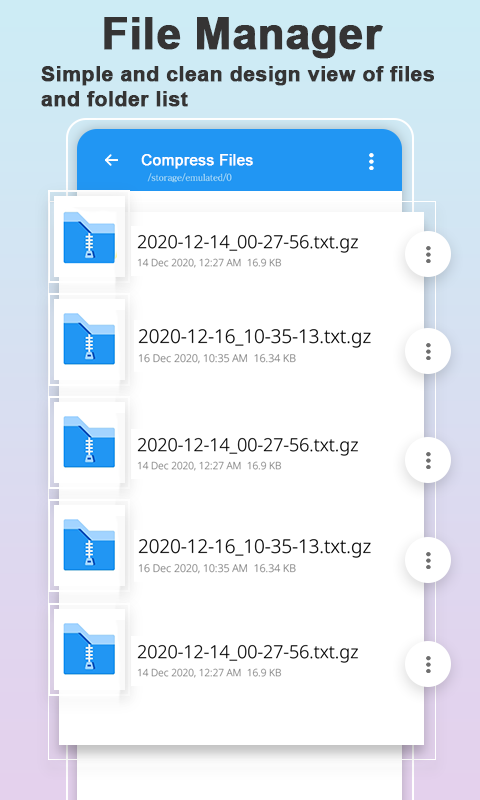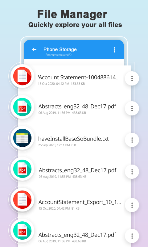 File Manager è lo strumento essenziale per organizzare, gestire e ottimizzare i tuoi file sui dispositivi Android. Con le sue funzionalità complete, l'interfaccia intuitiva e le prestazioni robuste, fornisce tutto ciò di cui hai bisogno per mantenere in ordine la tua vita digitale. Che tu abbia bisogno di gestire documenti, contenuti multimediali o dati di app, scarica File Manager oggi stesso e assumi il controllo della gestione dei file con facilità ed efficienza.