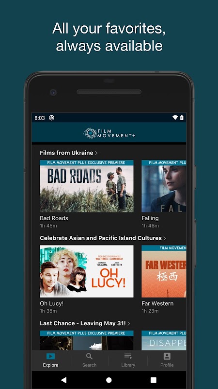 Come abbonato di Film Movement, avrai accesso illimitato alla nostra libreria di titoli appositamente curata e divertiti ovunque tu vada, su tutti i tuoi dispositivi. Da avvincenti documentari e straordinarie opere d'arte, a classici rivoluzionari e agli ultimi film stranieri, ti invitiamo ad unirti a noi nella nostra missione di mettere in luce e celebrare il cinema indipendente.
