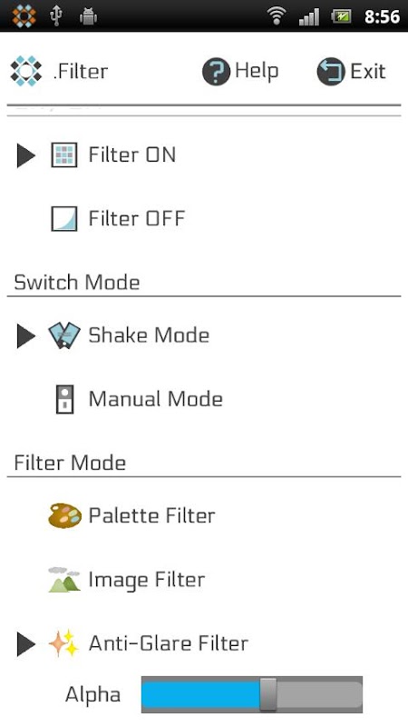 [4]When the Shake Mode, the filter is turned on / off by shake the smartphone. When the Manual Mode, on / off switches by clicking on the message of the notification bar.