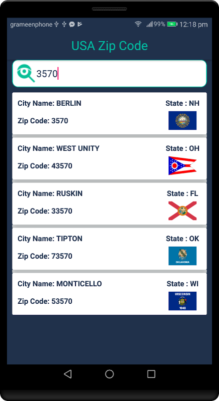 Questa applicazione consente di afferrare il codice postale postale di diverse città di Stati Uniti d'America molto facilmente