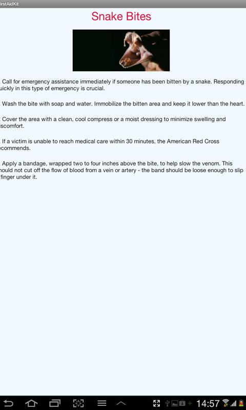 This application First Aid Kit is for creating awareness for the people who stuck with accidents and other common medical difficulties like Asthma, Unconsciousness, diabetics, Snake Bites, Road Accident, Burns, Fracture, Heart attack, Poisoning, Eye Injuries.