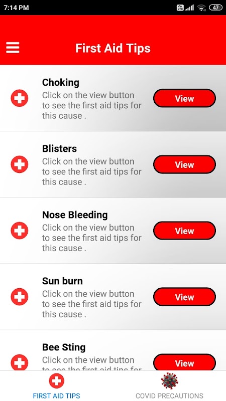 This is a First Aid App . This app contains most of the first aid tips . This app contains emergency numbers for most of the countries . This app also contains precautions from covid - 19 .