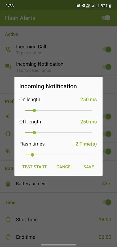 È possibile impostare il tempo per attivare la Avvisi Flash su chiamata, un messaggio, le notifiche