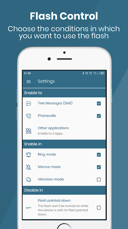 Se si preferisce, attivare la funzionalità per disattivare il flash quando sei con lui faccia in giù, non attivando il flash quando sei con il telefono appoggiato su un tavolo e coperto con flash (non sprecare inutilmente la batteria).