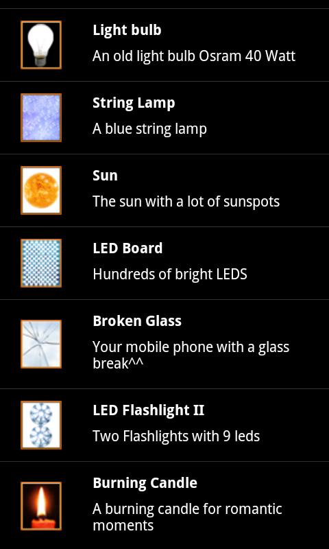 Mit Flashlight Gallery verwandeln Sie ihr Handy nicht nur in eine klassische Taschenlampe, die Ihnen Licht in Situationen, wie beispielsweise im Kino, in der Disco, im Auto oder in dunklen Räumen bietet, sondern auch in eine brennende Kerze, Glühbirne, LED-Lampe oder strahlende Sonne.