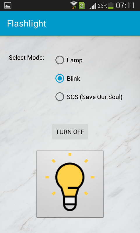 This “Flashlight” application enables your phones to act as a flashlight using the camera flashlight. It provides the image of lamp on the application screen as feedback indicator of the status of the camera flashlight on the phone, so when the camera flashlight is on, the application will display the “on” image, and when the camera flashlight is off, the application also will display the “off” image.