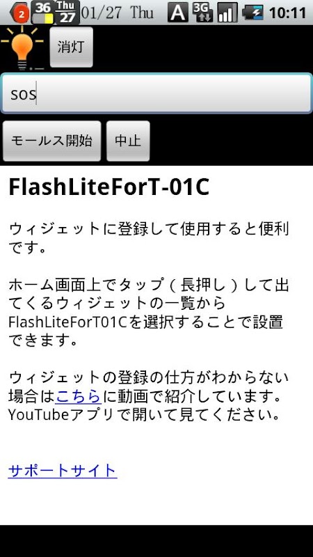 SOSなど文字を入力してボタンを押すと それを自動でモールスに変換してフラッシュが点滅します。