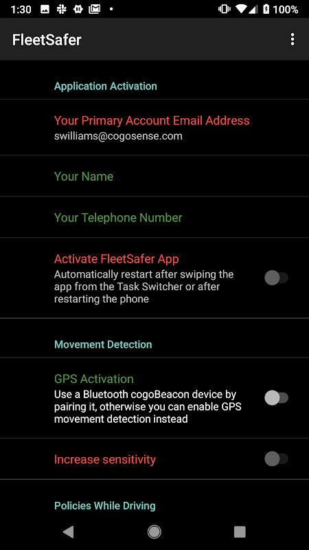 FleetSafer richiede un account aziendale Cogosense. FleetSafer utilizza il GPS o un dispositivo smart cogoB collegato per impegnarsi automaticamente quando viene rilevato un movimento di guida, disabilitando l'accesso al dispositivo e silenziando tutte le chiamate e le notifiche. La funzionalità di chiamata di testo, social ed e-mail è disabilitata. Il comportamento alla guida è monitorato.