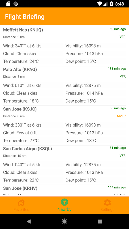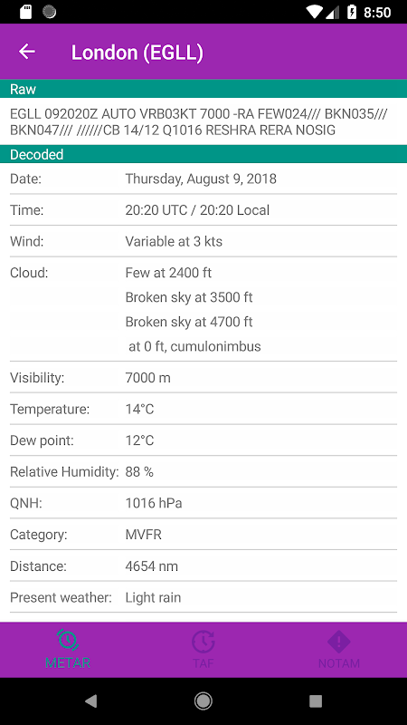 Flight Briefing è un'applicazione mobile che consente ai piloti di recuperare i dati METAR, TAF e NOTAM per le stazioni di tutto il mondo. Le stazioni preferite possono essere salvate e l'applicazione decodificherà anche tutti i dati in modo che sia più facile da leggere. È anche possibile visualizzare i report dalle stazioni vicine utilizzando la funzionalità di localizzazione del dispositivo. Tutte le funzionalità sono facilmente accessibili da un sistema di navigazione semplice e intuitivo.