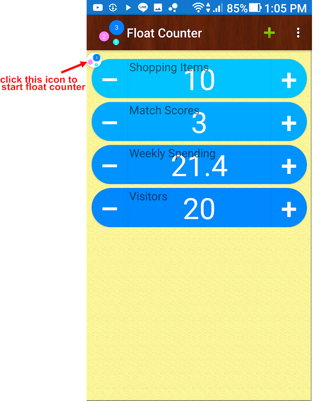 -Questo è un comodo contatore che può fluttuare ovunque sullo schermo. puoi contare qualsiasi cosa, numero di visitatori, tempi di nuoto, punteggi delle partite, articoli di inventario, sigarette fumate, ...