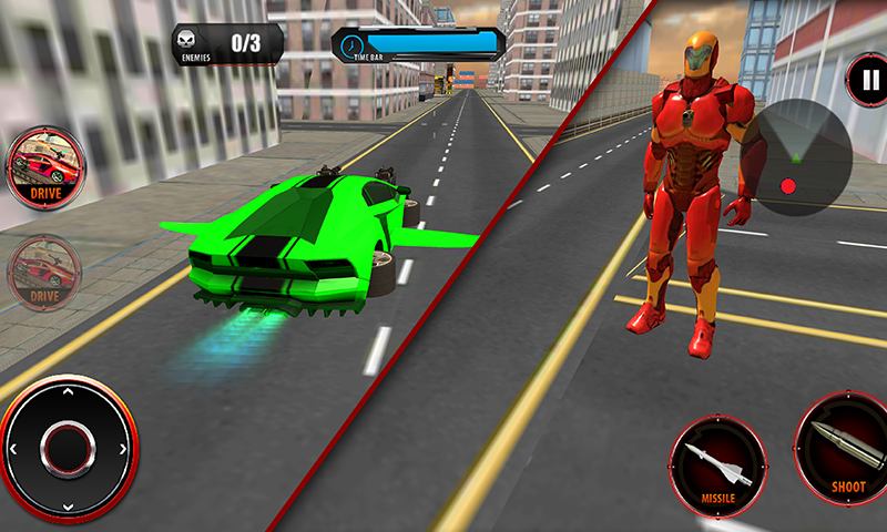 Rescue the city using flying car and perform virtual action as Robot to crush the enemies from your shooting skills !