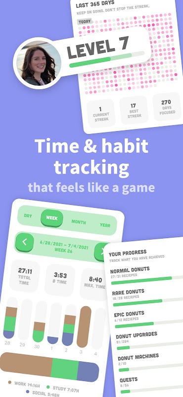 Ma attenzione alle distrazioni! Se esci dall'app, la tua macchina per ciambelle si fermerà. Il senso di realizzazione e responsabilità per Focus ti motiverà a stare lontano dal telefono e a fare più cose. I tuoi progressi vengono visualizzati con statistiche dettagliate che aiutano nella gestione del tempo e riducono il tempo davanti allo schermo.