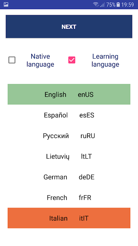 App makes you focus on learning most common words of language. Where is ~1500 most common words. You can choose from few popular languages to learn - English, Spanish, Italian, German, Russian, French. You can also make your own list of word of any language, publish it on internet and upload to the app. Depending on your device app can synthesize speech from given word in many languages (Text to speech). You can also use this app for learning list of capitals and countries or other similar lists.